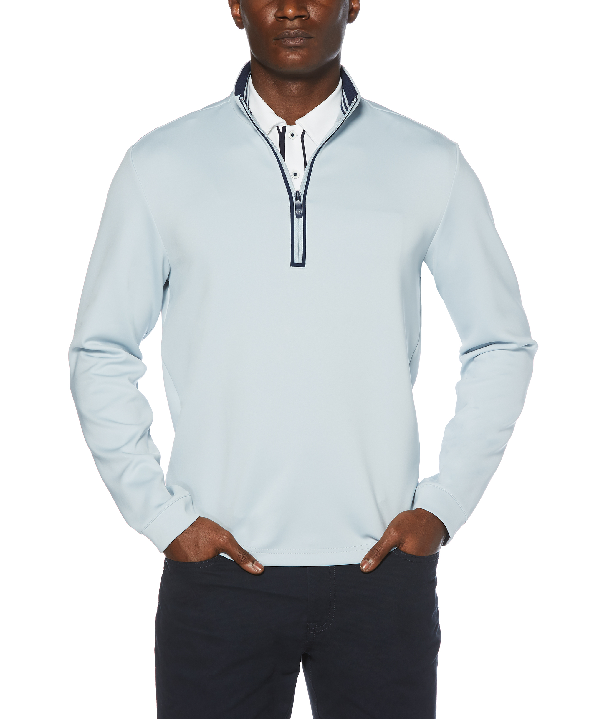 7.8 oz. 90% polyester. 10% spandex. 1/4-zip with contrast tipping around zipper. 1x1 rib knit inside mock neck. Contrast embroidered Pete logo on front left collar.