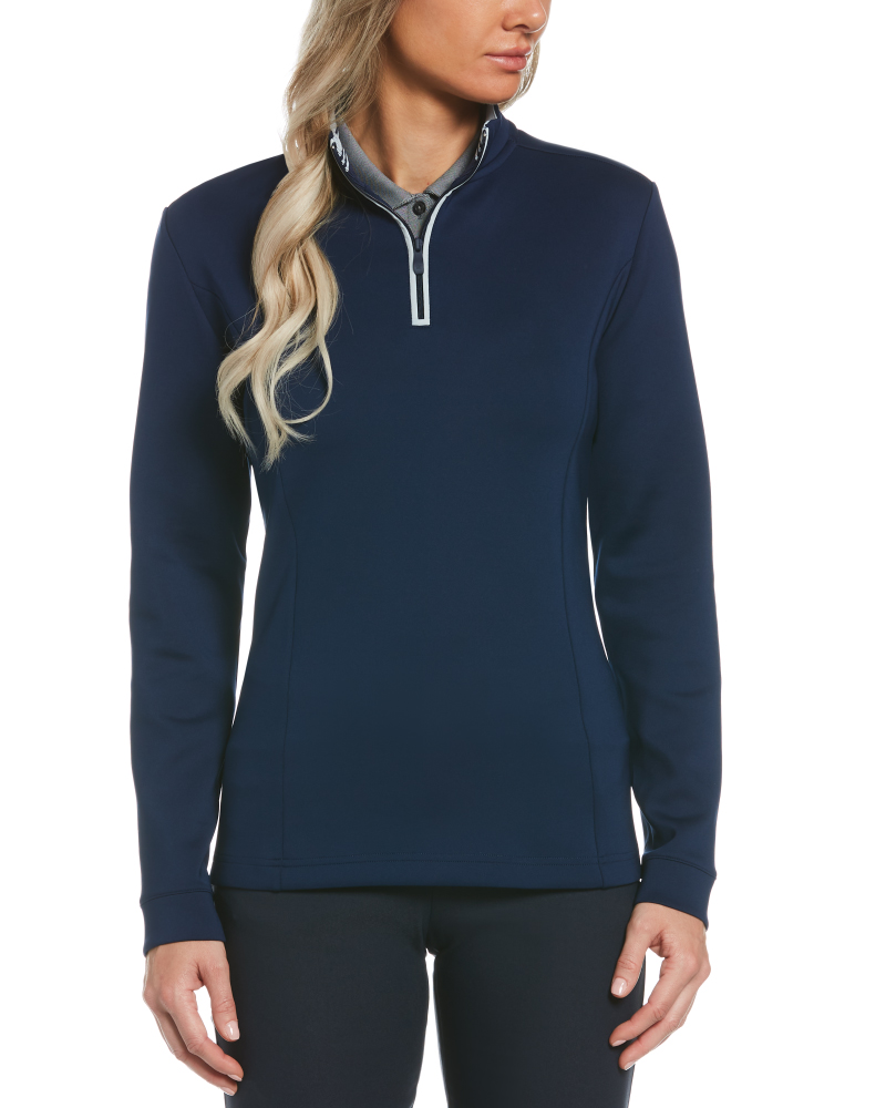 7.8 oz 90% Polyester / 10% Spandex. 1/4 Zip with Contrast tipping around zipper. 1 x 1 Rib knit inside mock neck. Contrast embroidered Pete logo on front left collar.