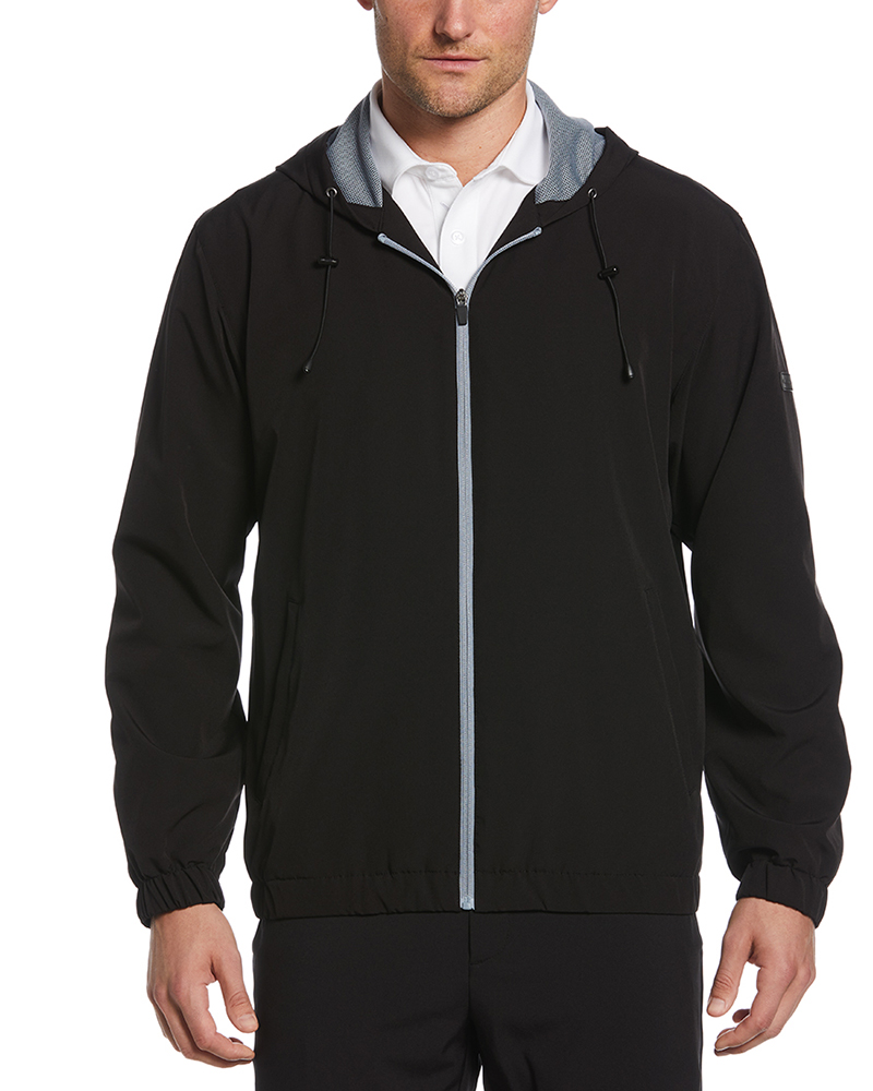 6.2 oz. 91% polyester. 9% Elastane. Water Repellent Finish. Full zip with reverse coil zipper. Front welt pockets. Adjustable drawcord waist. Tonal Perry Ellis patch on left sleeve.