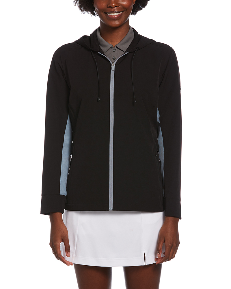 6.2 oz. 91% polyester. 9% Elastane. Water Repellent Finish. Full zip with reverse coil zipper. Front welt pockets. Single needle hem with 1 1/4 ” elastic hem. Tonal Perry Ellis patch on left sleeve.