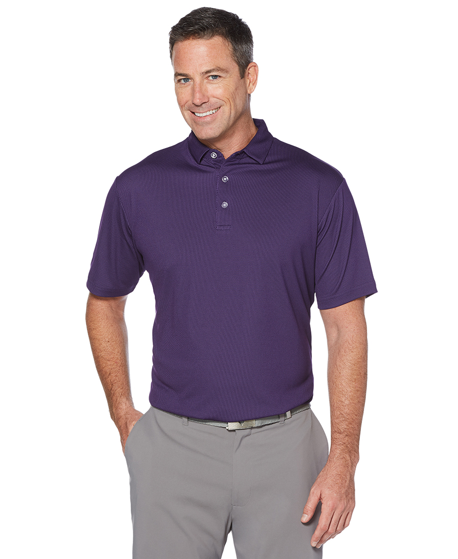 4.3 oz 100% polyester double knit Jacquard fabric. Opti-Dri technology transfers moisture away from the body to keep you cool and dry. UV Repel technology keeps skin safe from the sun's harmful rays. UPF 15+. Self fabric collar. 5-button placket with Callaway embossed buttons. Rounded bottom with double needle stitching and side vents. Heat seal label provides tag-free comfort. Contrast heat seal Callaway logo on back neck.