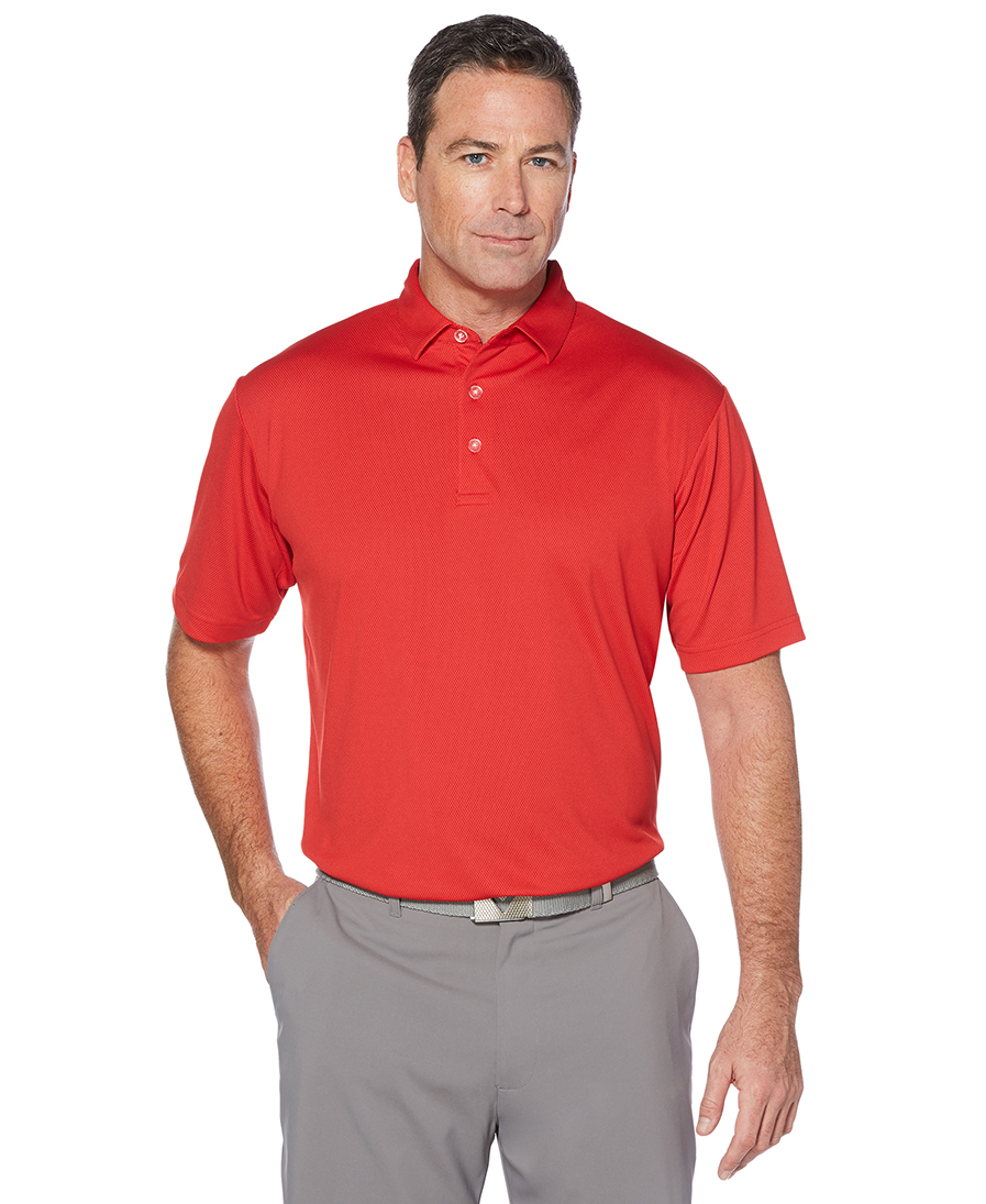 4.3 oz 100% polyester double knit Jacquard fabric. Opti-Dri technology transfers moisture away from the body to keep you cool and dry. UV Repel technology keeps skin safe from the sun's harmful rays. UPF 15+. Self fabric collar. 5-button placket with Callaway embossed buttons. Rounded bottom with double needle stitching and side vents. Heat seal label provides tag-free comfort. Contrast heat seal Callaway logo on back neck.