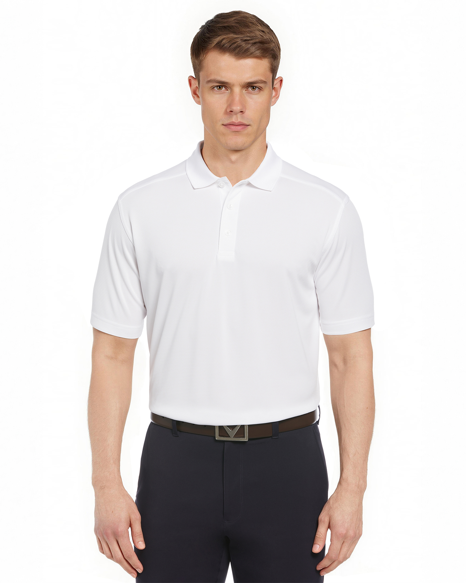 5.6 oz 100% polyester double knit mesh fabric. Opti-Dri technology transfers moisture away from the body to keep you cool and dry. Rib knit collar and open sleeve. 4-button slim line placket with Callaway embossed buttons. Front darts add contour. Rounded bottom with double needle hem. Heat transfer Chevron logo on back neck.
