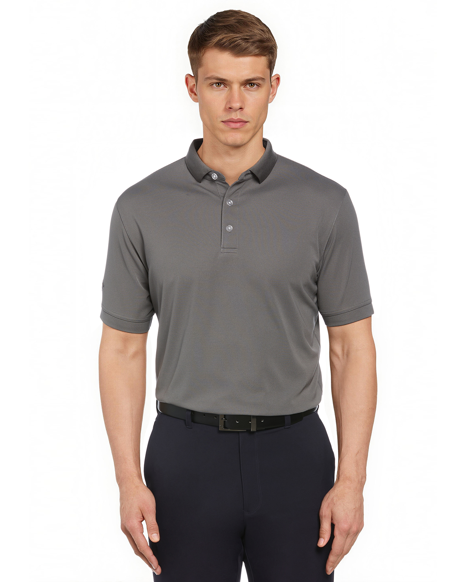 5.6 oz 100% polyester ottoman texture knit fabric. Opti-Dri technology transfers moisture away from the body to keep you cool and dry. UV Repel technology keeps skin safe from the sun's harmful rays. UPF 15+. Rib knit collar. 6-button placket with Callaway embossed buttons. Double needle hemmed bottom with side vents. Heat seal label provides tag-free comfort. Contrast embroidered Chevron on back neck.