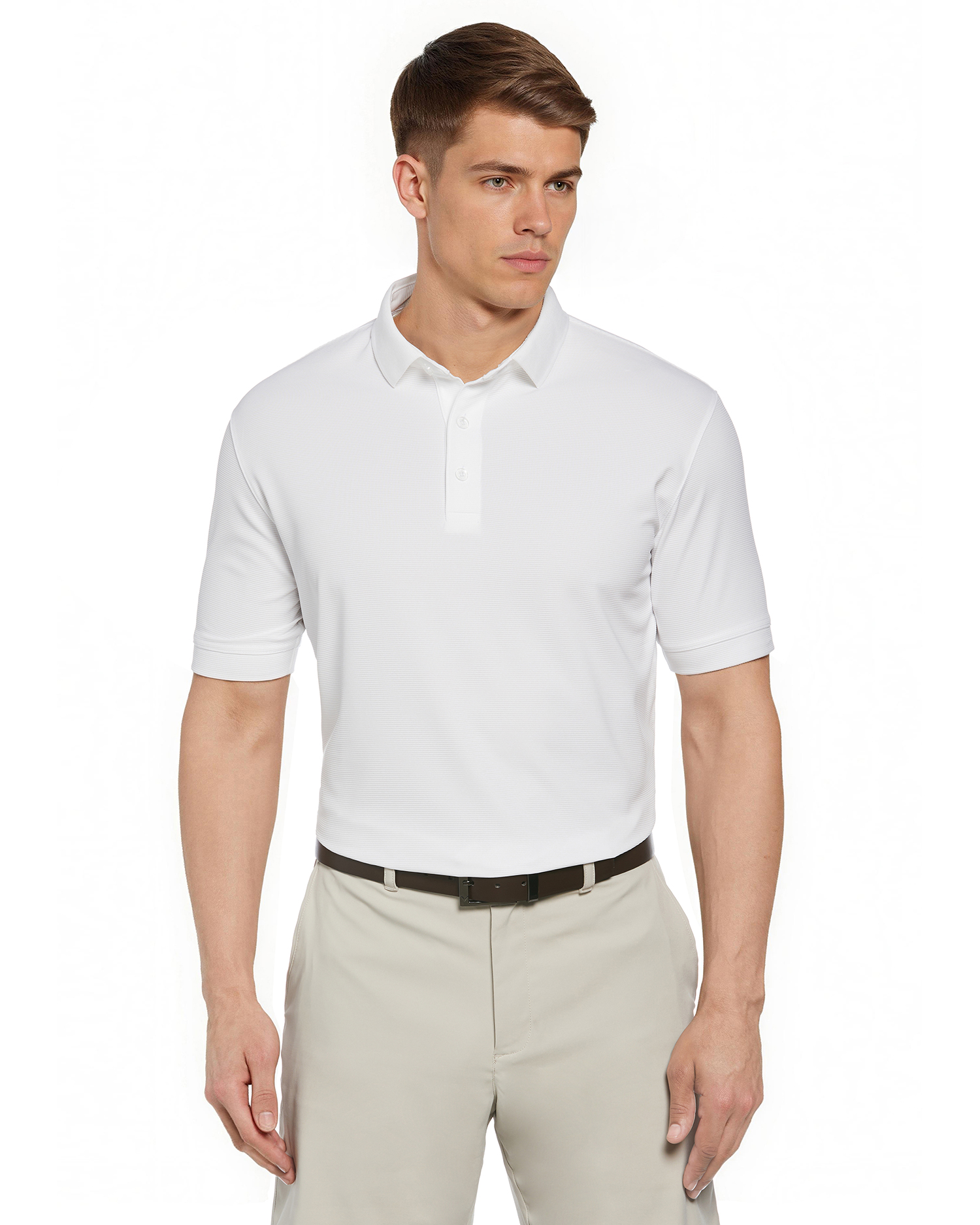 5.6 oz 100% polyester ottoman texture knit fabric. Opti-Dri technology transfers moisture away from the body to keep you cool and dry. UV Repel technology keeps skin safe from the sun's harmful rays. UPF 15+. Rib knit collar. 6-button placket with Callaway embossed buttons. Double needle hemmed bottom with side vents. Heat seal label provides tag-free comfort. Contrast embroidered Chevron on back neck.