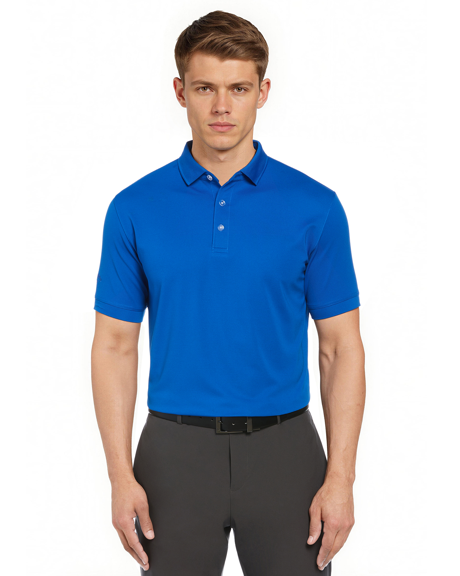 5.6 oz 100% polyester ottoman texture knit fabric. Opti-Dri technology transfers moisture away from the body to keep you cool and dry. UV Repel technology keeps skin safe from the sun's harmful rays. UPF 15+. Rib knit collar. 6-button placket with Callaway embossed buttons. Double needle hemmed bottom with side vents. Heat seal label provides tag-free comfort. Contrast embroidered Chevron on back neck.