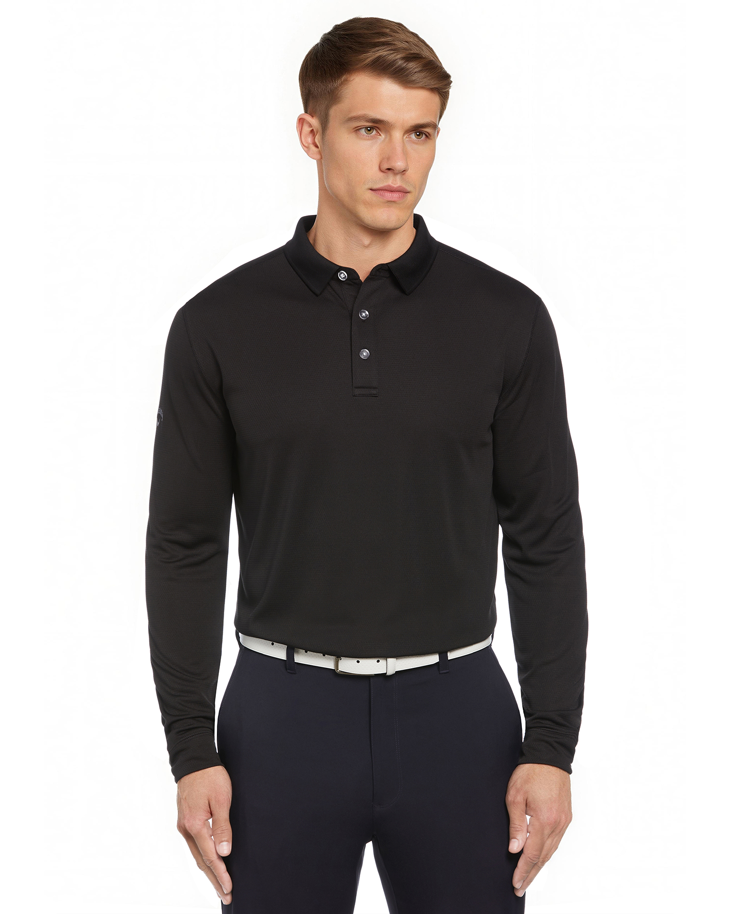 5.4 oz 95% polyester / 5% spandex jersey knit poly blend. Opti-Dri technology transfers moisture away from the body to keep you cool and dry. Stretch to give you full range of motion. UV Repel technology keeps skin safe from the sun's harmful rays. UPF 50. 3-snap placket with Chevron embossed snaps. Bottom coverstitch hem. Self-fabric collar. Heat seal label provides tag-free comfort. Contrast heat seal Chevron logo on back collar.